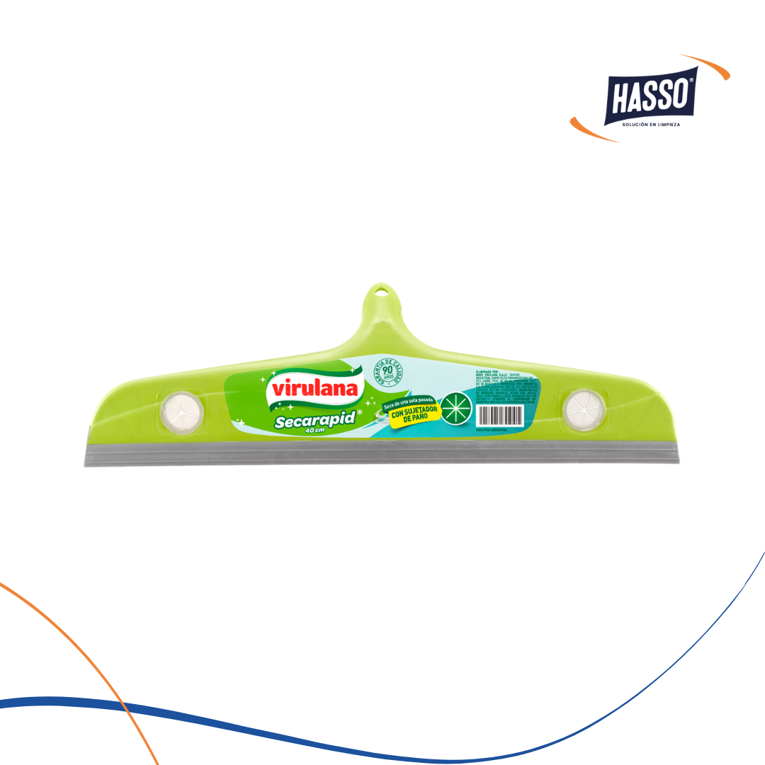 Seca de una sola pasada. Su borde de goma otorga una mayor adherencia al piso. Posee un sistema con sujetador para evitar que el paño se suelte fácilmente.